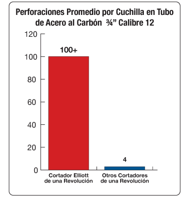 Al comparar la One-Rev de Elliott con las cortadoras de otros fabricantes, la cortadora de Elliott pudo realizar más de 100 perforaciones mientras que las otras solamente 4. Como resultado, la cortadora One-Rev de Elliott tiene la potencia para producir 24 veces más perforaciones de tubos por cuchilla cuando se compara con otras marcas. En un trabajo que requiere de 100 perforaciones, significa un ahorro aproximado de USD 1,100 en cuchillas. En general, el diseño mejorado de la cortadora One-Rev de Elliott tuvo un desempeño sustancialmente más elevado que las cortadoras de otros fabricantes.