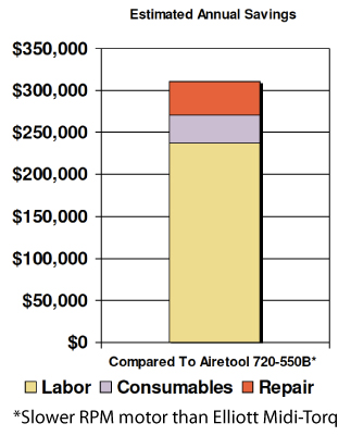 By using the Elliott Midi-Torq, CTI Industries realizes over $300,000 in savings per year as compared to using Airetool™ motor, 720-550B.