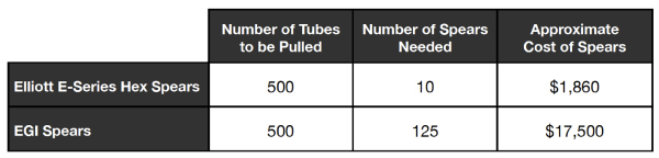 Considering a similar job with 500 tubes, using Elliott E-Series hex spears would eliminate 25 hours in downtime due to spear breakage and save over $15,000 in tooling cost.