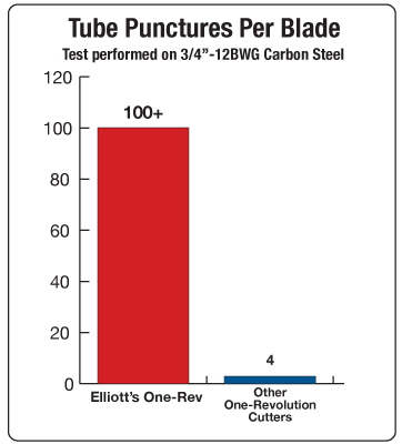 When comparing Elliott’s One-Rev to that of other manufacturers, Elliott’s cutter was able to create over 100 punctures while leading competitors only produced 4. As a result, Elliott’s One-Rev has the power to produce over 24X more tube punctures per blade when compared to other brands. On a job requiring 100 punctures, that’s an approximate savings of over $1,100 in blades. Overall, Elliott’s improved One-Rev cutter design performs significantly higher than that of other manufacturers.