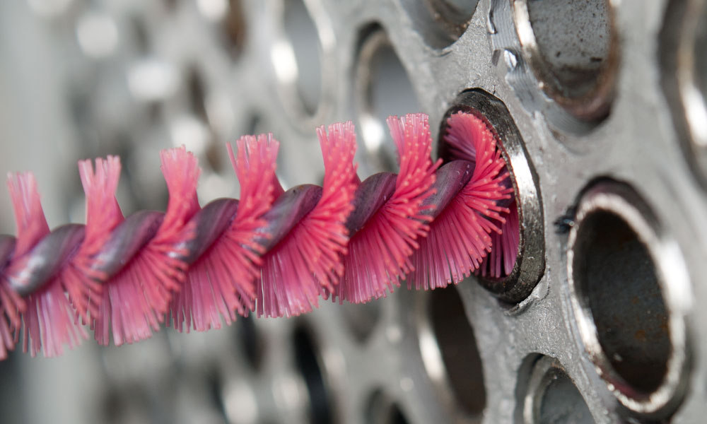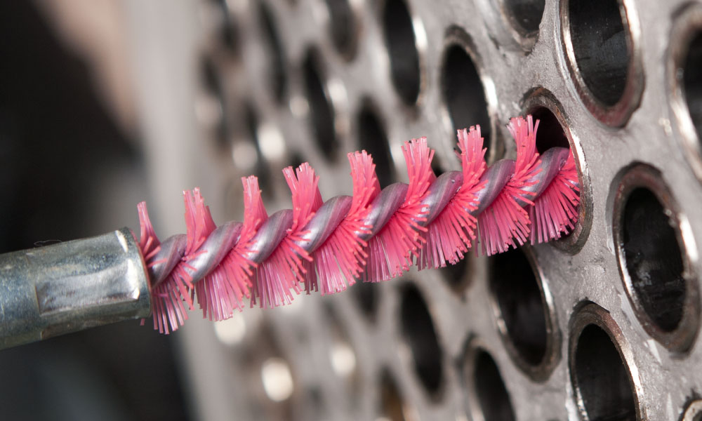 Now pull the brush out of the tube. Since the brush is larger than the ID of the tube the bristles are slightly laid over in one direction. When pulling out the Die-Hard brush, some resistance should be felt. Insert the next smaller brush size onto the Actuator and insert it into the tube past the rolled/expanded area. Repeat this process until no resistance is felt and the brush slides freely in and out of the tube. The correct brush size for cleaning is the smallest brush size in which resistance is felt. This is to ensure that the ends of the bristles are making contact with the tube wall, but not too large to restrict the feeding of the Auto-Feed Hose, and pulsing action of the Actuator.